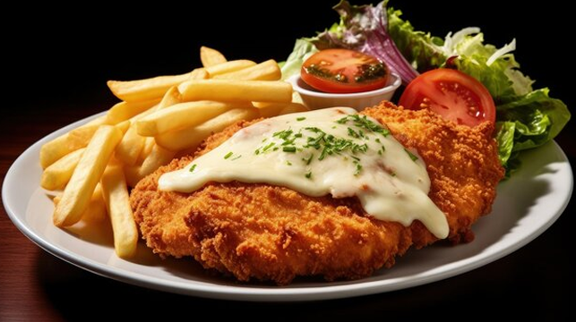Veg patty, lettuce, tomato, slice cheese, tomato relish, brioche bun served with chips and aioli.